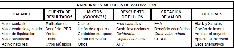 Los métodos de valoración pueden variar según la naturaleza de la empresa y el propósito de la valoración, incluyendo enfoques basados en ingresos, comparables de mercado, y valor de activos. Si consideramos a las compañías como fuentes generadoras de flujos financieros continuados en el futuro, y en la que las sus acciones y sus deudas son valorables como activos financieros, entonces los métodos considerados «conceptualmente» correctos para valorar empresas con expectativas de continuidad son aquellos cuya base de cálculo reside en los descuentos de flujos. Sin embargo existen otros métodos de valoración aplicables en otros casos que generalmente se clasifican en seis grupos